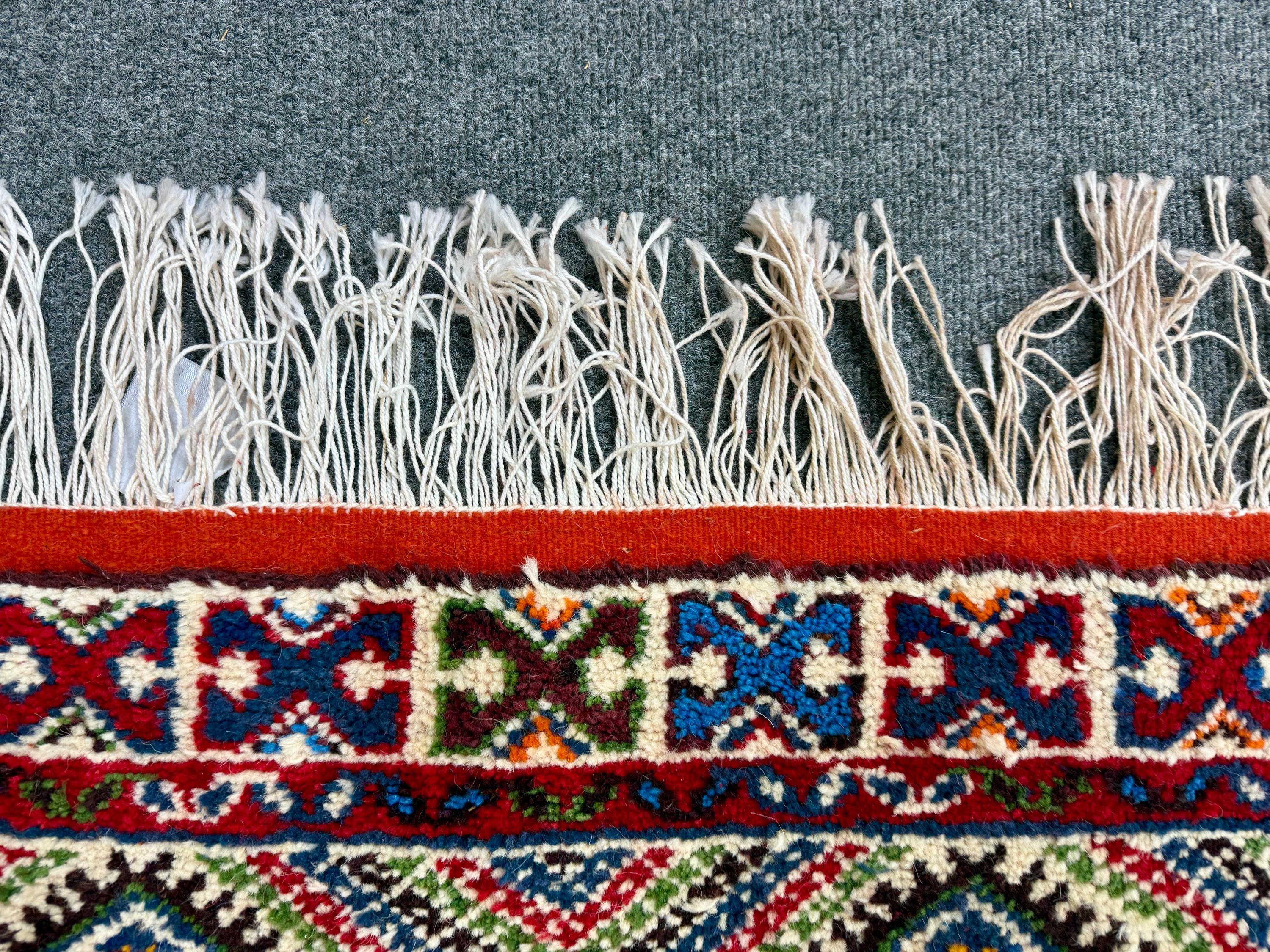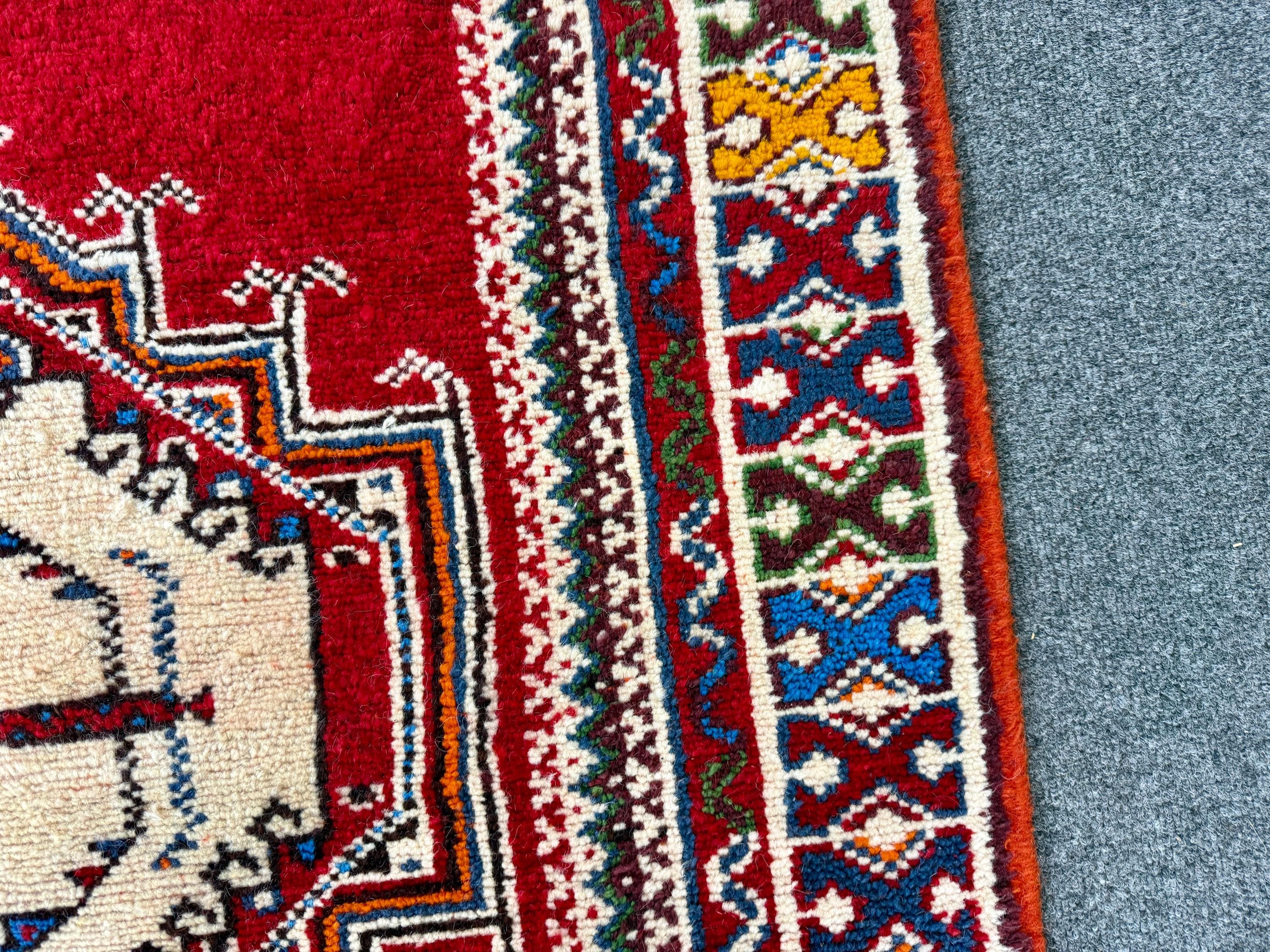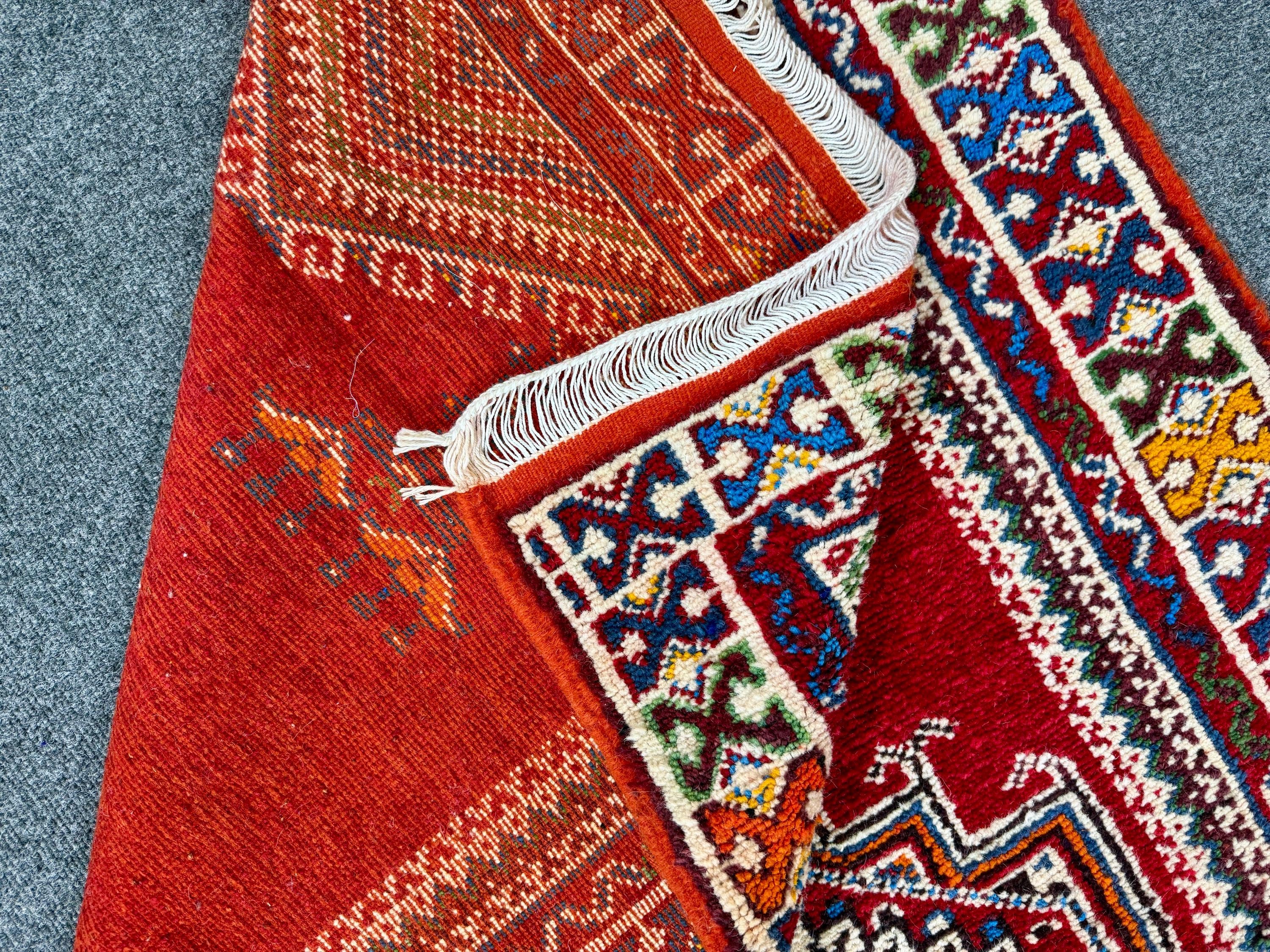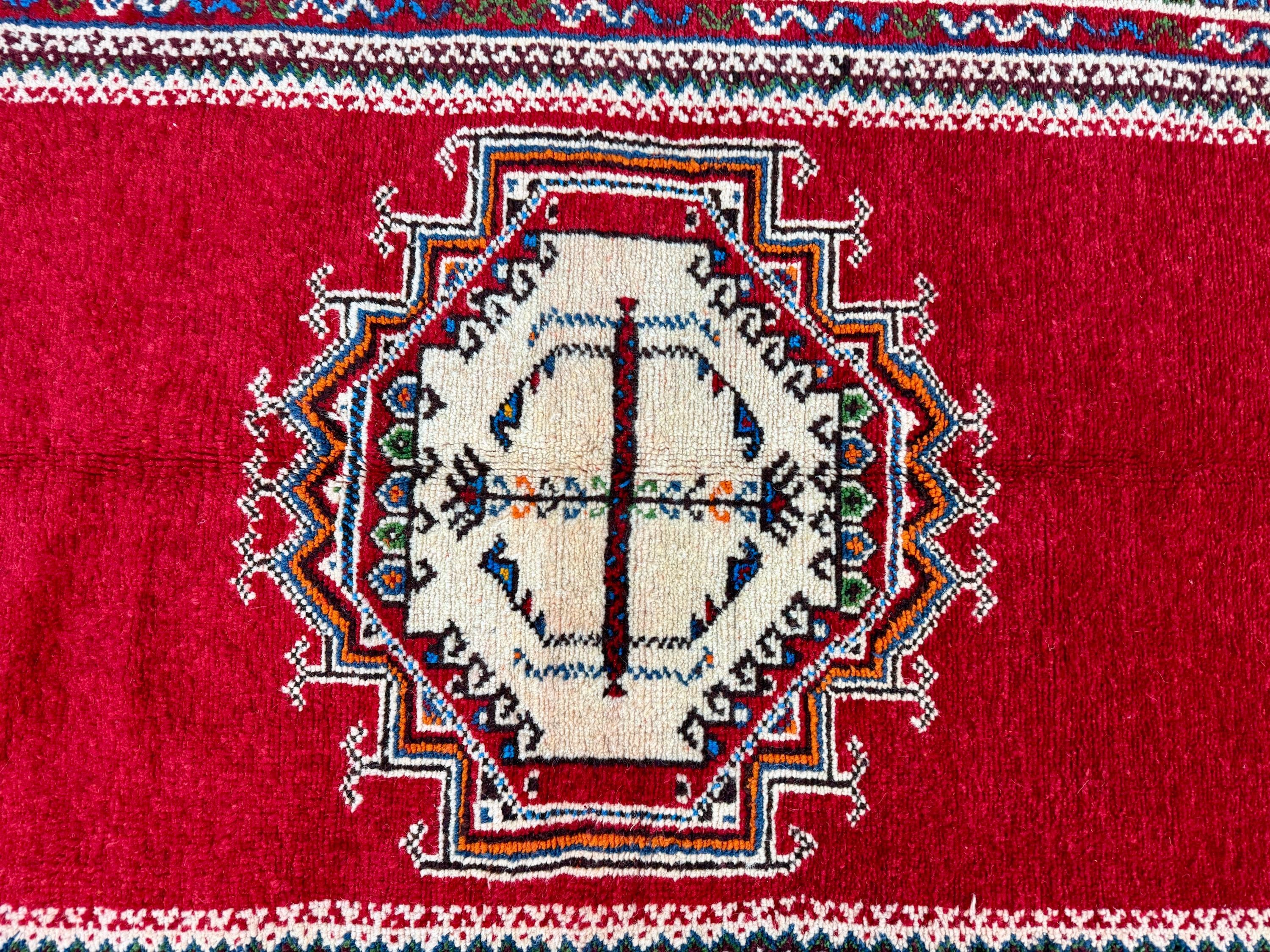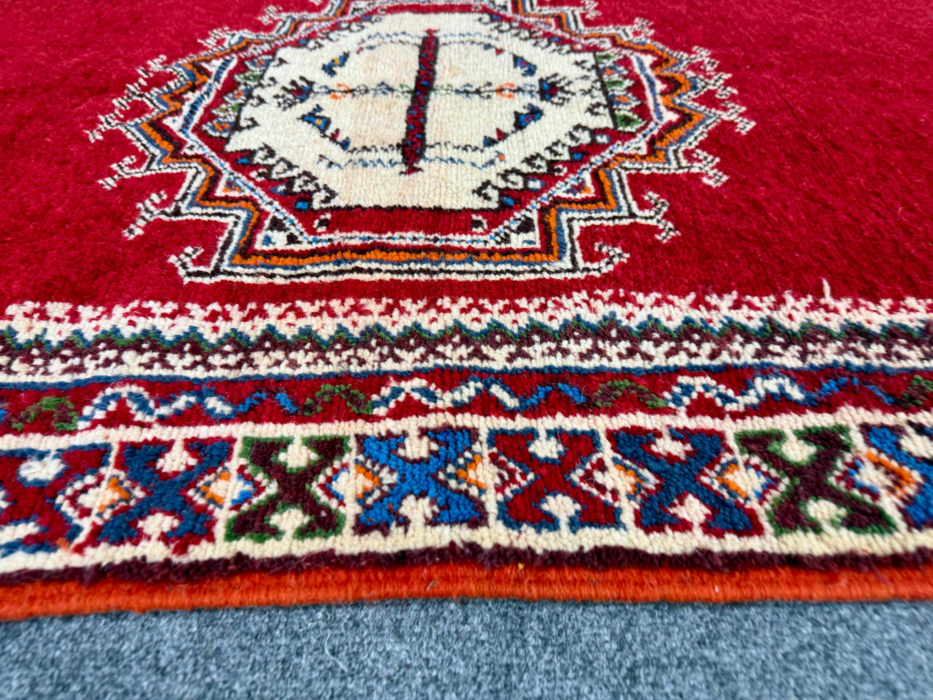 This red Moroccan rug is an authentic Berber Taznakhet rug, entirely handwoven from natural wool by skilled women artisans in the Taznakhet region of Morocco. Known for their fine weaving and rich symbolism, Taznakhet rugs are among the most refined and expressive rugs in Moroccan tradition.