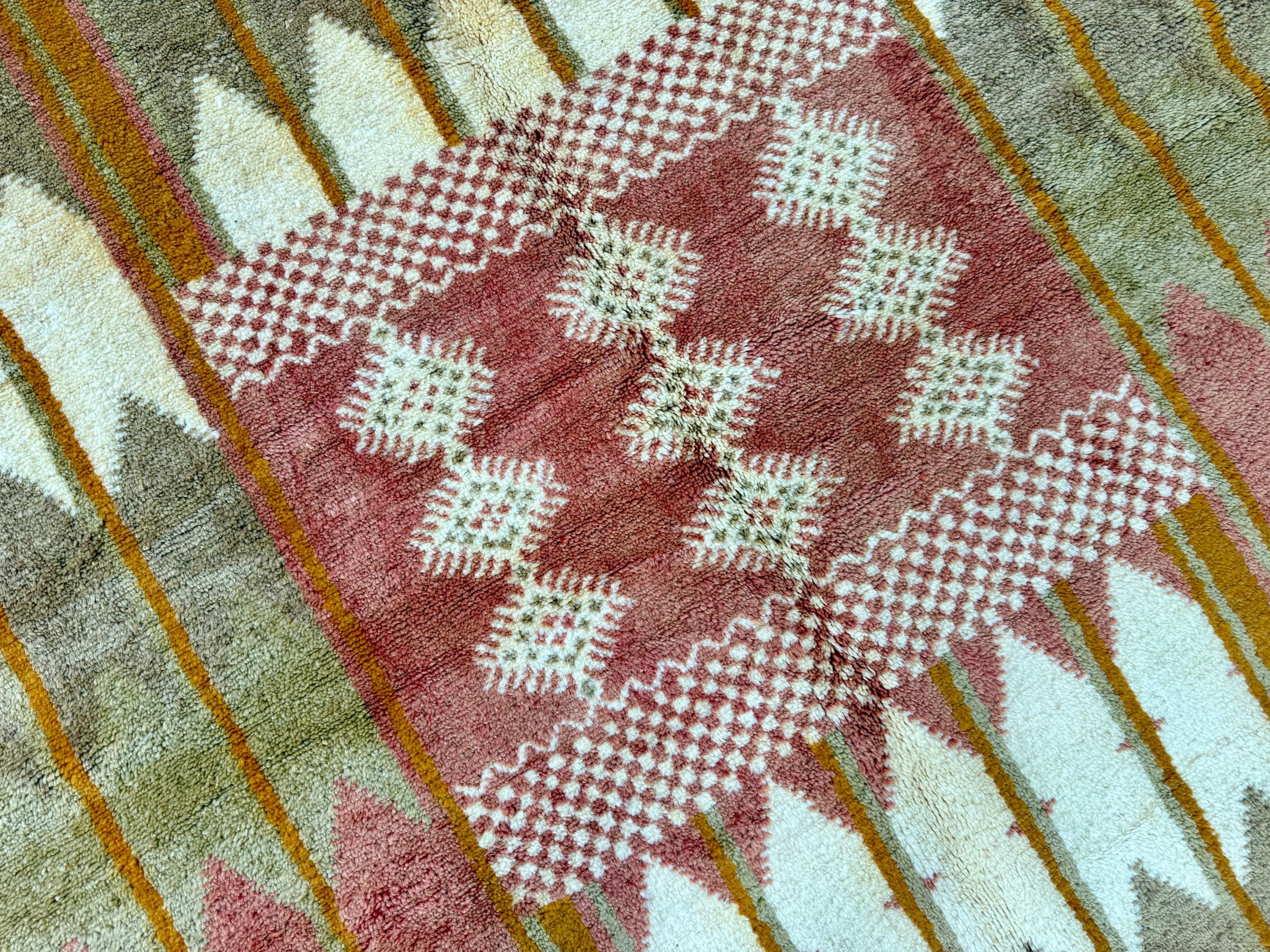 This vintage Boujaad Berber rug is an authentic Moroccan treasure, entirely handwoven from natural wool by Berber women artisans in the Boujaad region of Morocco. Known for their expressive colors and symbolic patterns, Boujaad rugs are deeply personal pieces that reflect the weaver’s life, emotions, and stories.